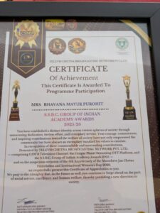 ભાવના મયૂર પુરોહિત ને તેમનાં લેખન અને સમાજ સેવા માટે મોટી ઉંમર ની